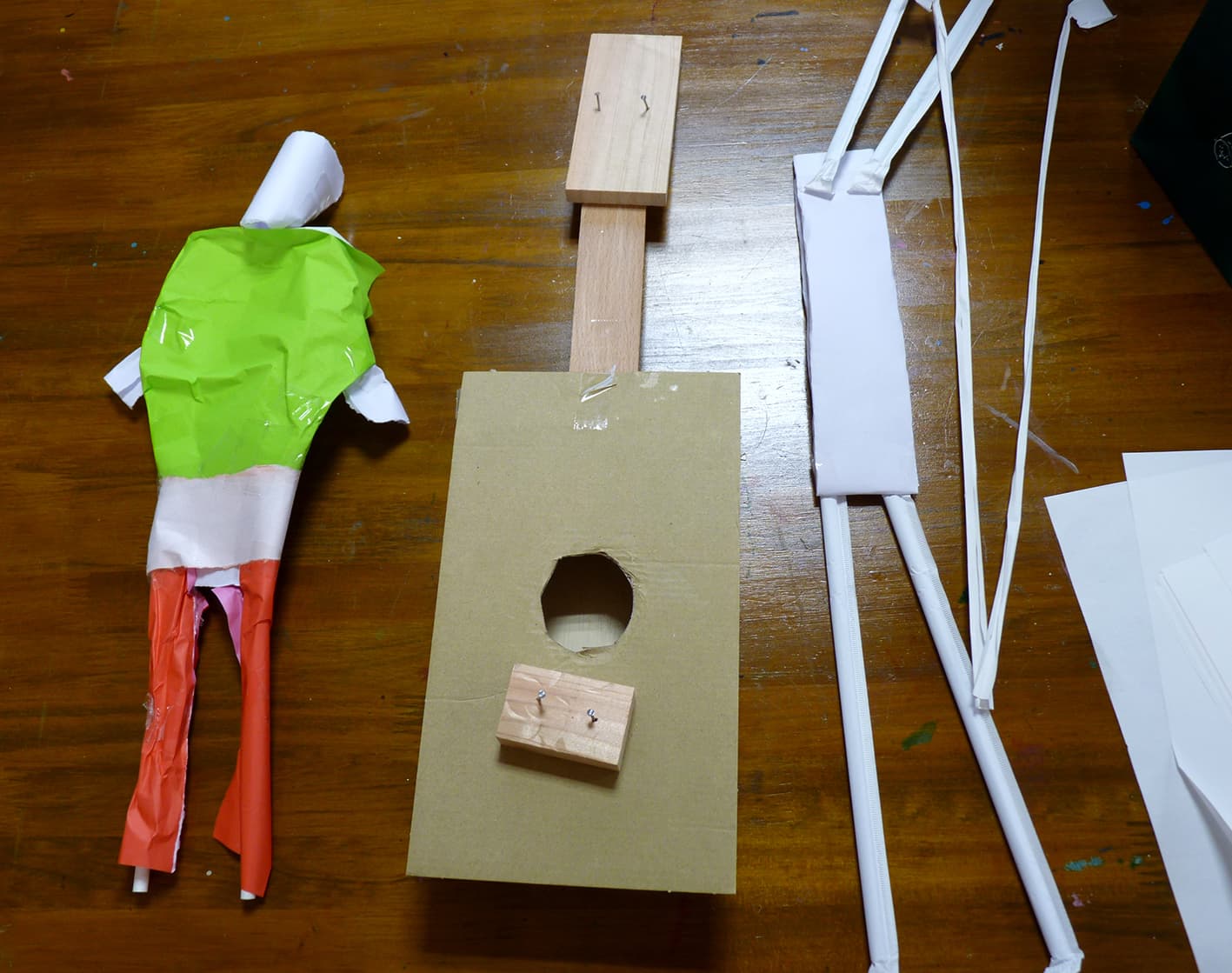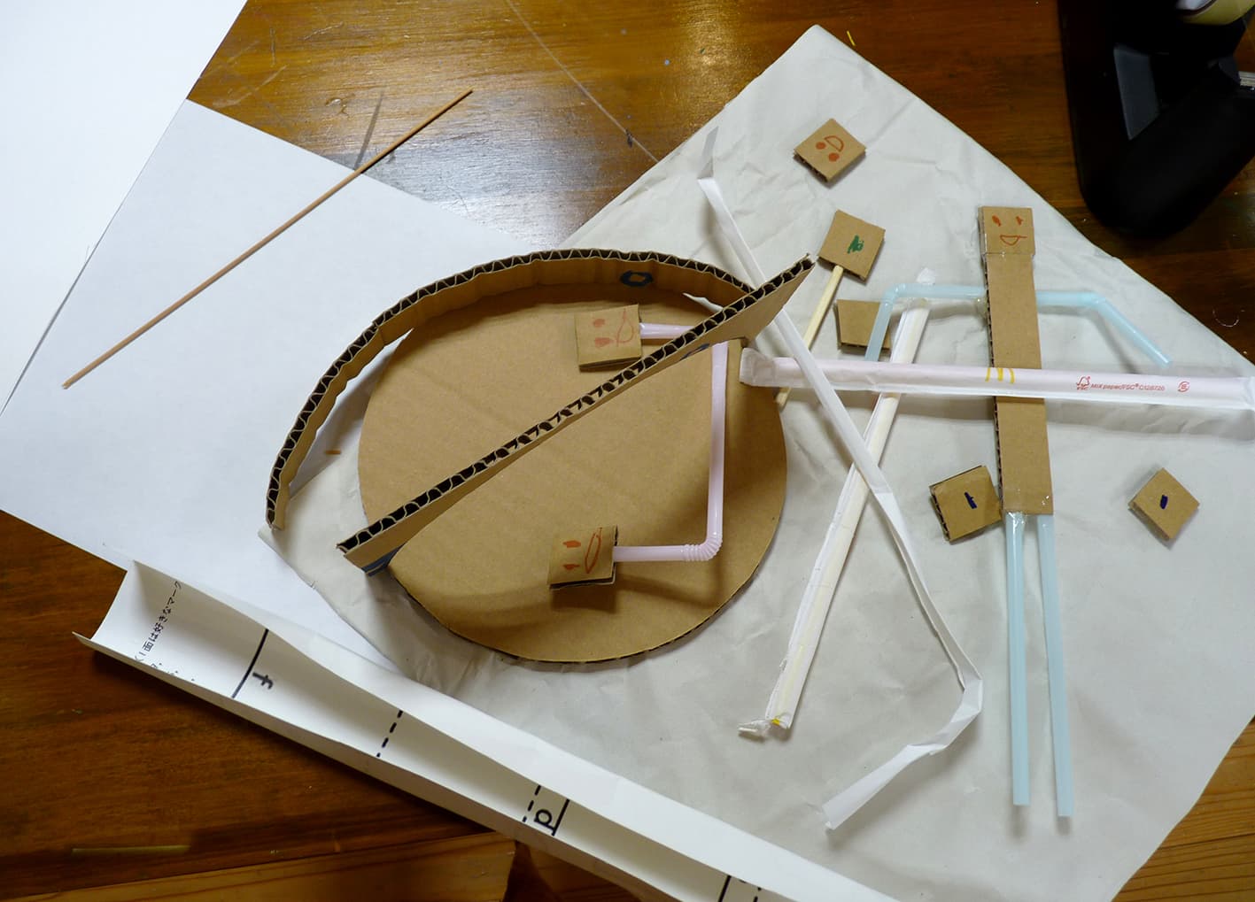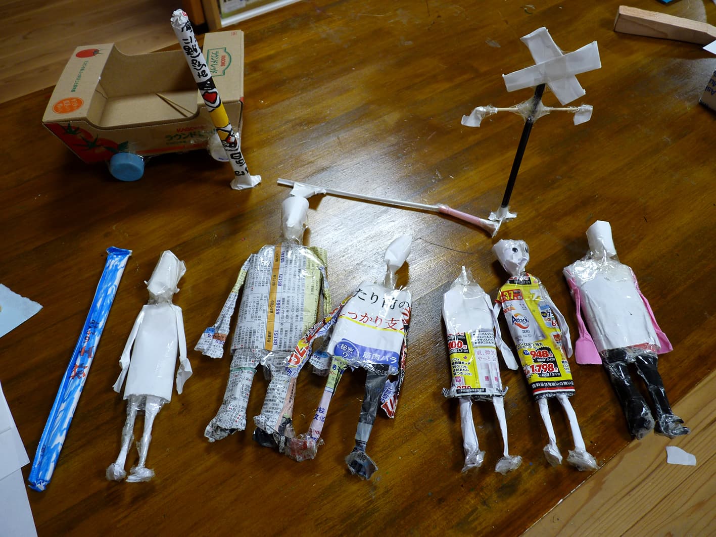 『竹ひご、ストロー、割りばしと好きなものは細くて長いもの。なければ自分で紙を細く切って折り曲げてつくります。お気に入りはいつも手に持ちあちこち歩きながら、突如舞い降りる創作のアイデアに猛スピードで手が動きます。生まれた人型は全て“パパ”だそう。服を着せたり、靴を履かせたり、紙工作で作りこみ、またふと次の創作へ展開してゆきます。生きることと作ることがとても近くにある彼の生活を垣間見るようです。(絵画教室の先生より)』