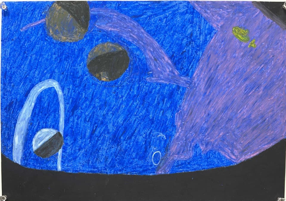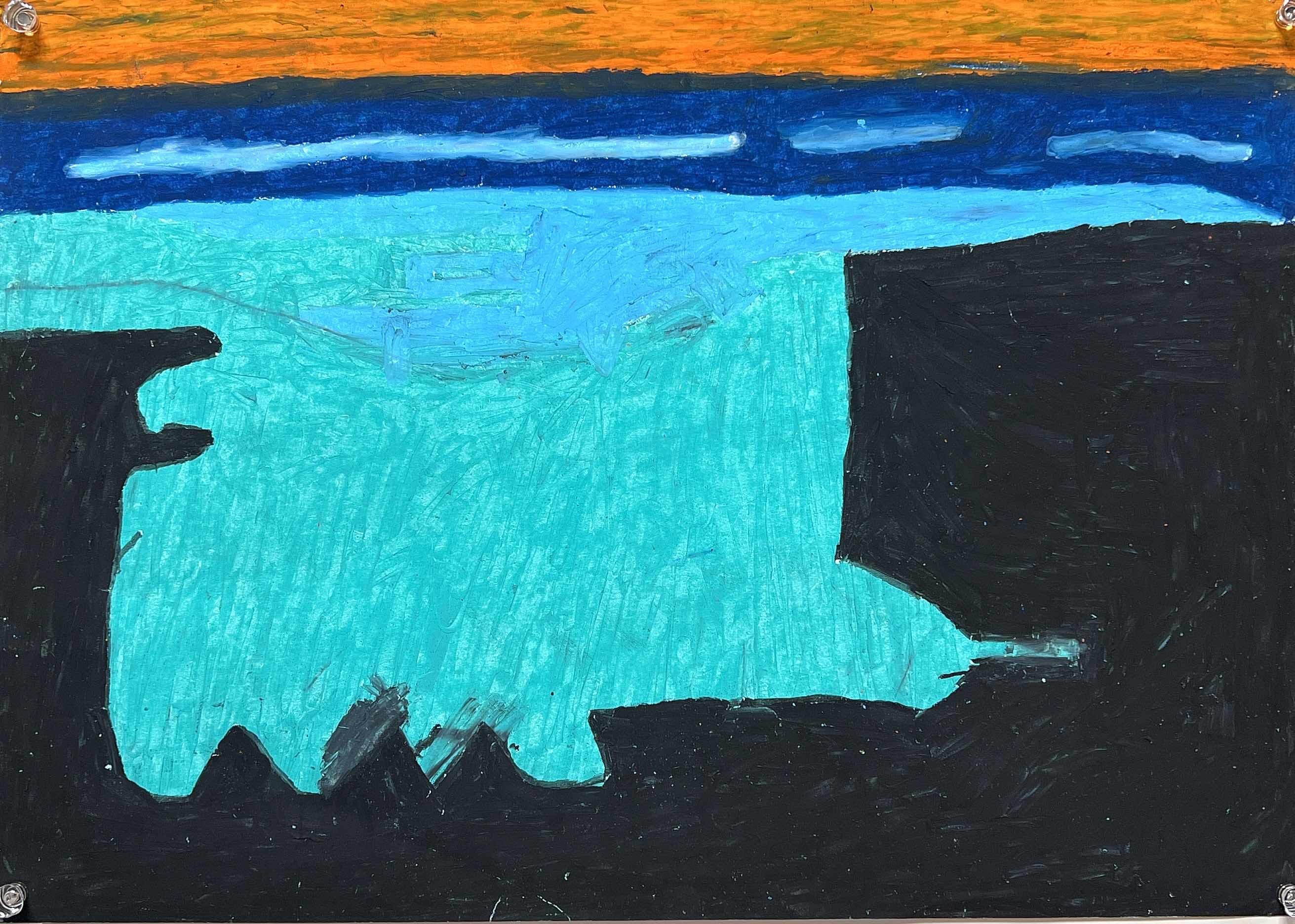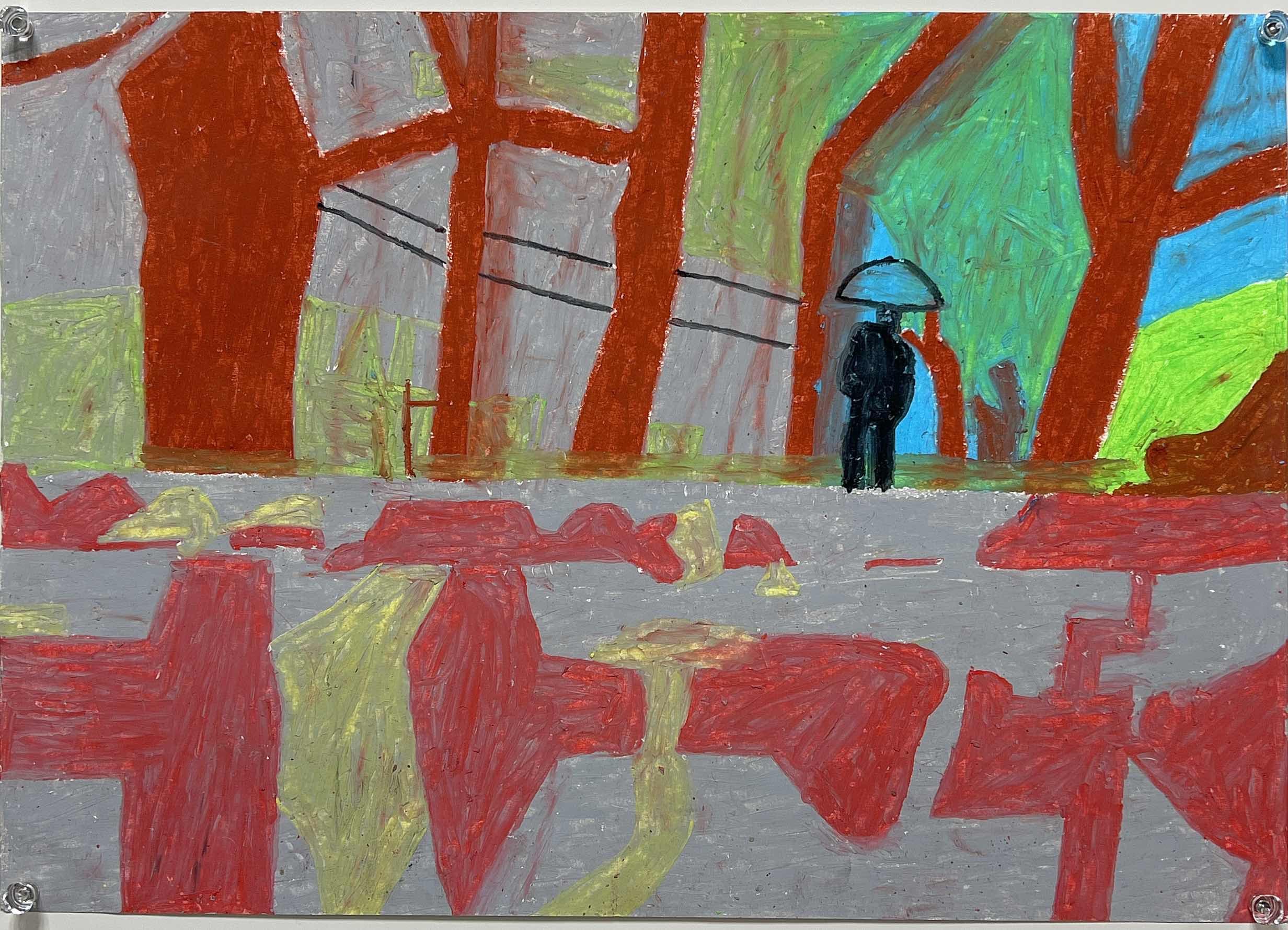 『ご覧頂きありがとうございます。作者は藤井健太で、年齢は27歳になります。青陽東絵画教室へ通い始めて10年近くたちます。いつも通うのをとても楽しみにしています。始めの頃は、クレパスで1~2色を画用紙いっぱいに塗るだけでしたが、本人が自閉症なので何かを見て描くほうが描きやすいかと思い、また先生からの助言もあり、写真(新聞の切り抜き)を用意すると今の作風のようになりました。描いている時は集中して、速くクレパスが折れるほど力強く描きます。作品は、本人の感性でもとの写真からはだいぶ変形され、色も少し違うものが選ばれていたりします。ご覧になって、もとの写真はどんな風か想像してみたり、温かい空気感が伝わりましたらうれしいです。(お母様より)』