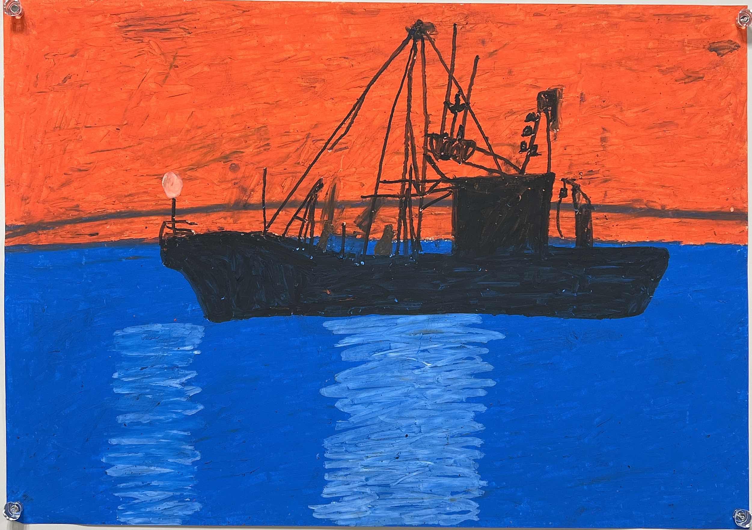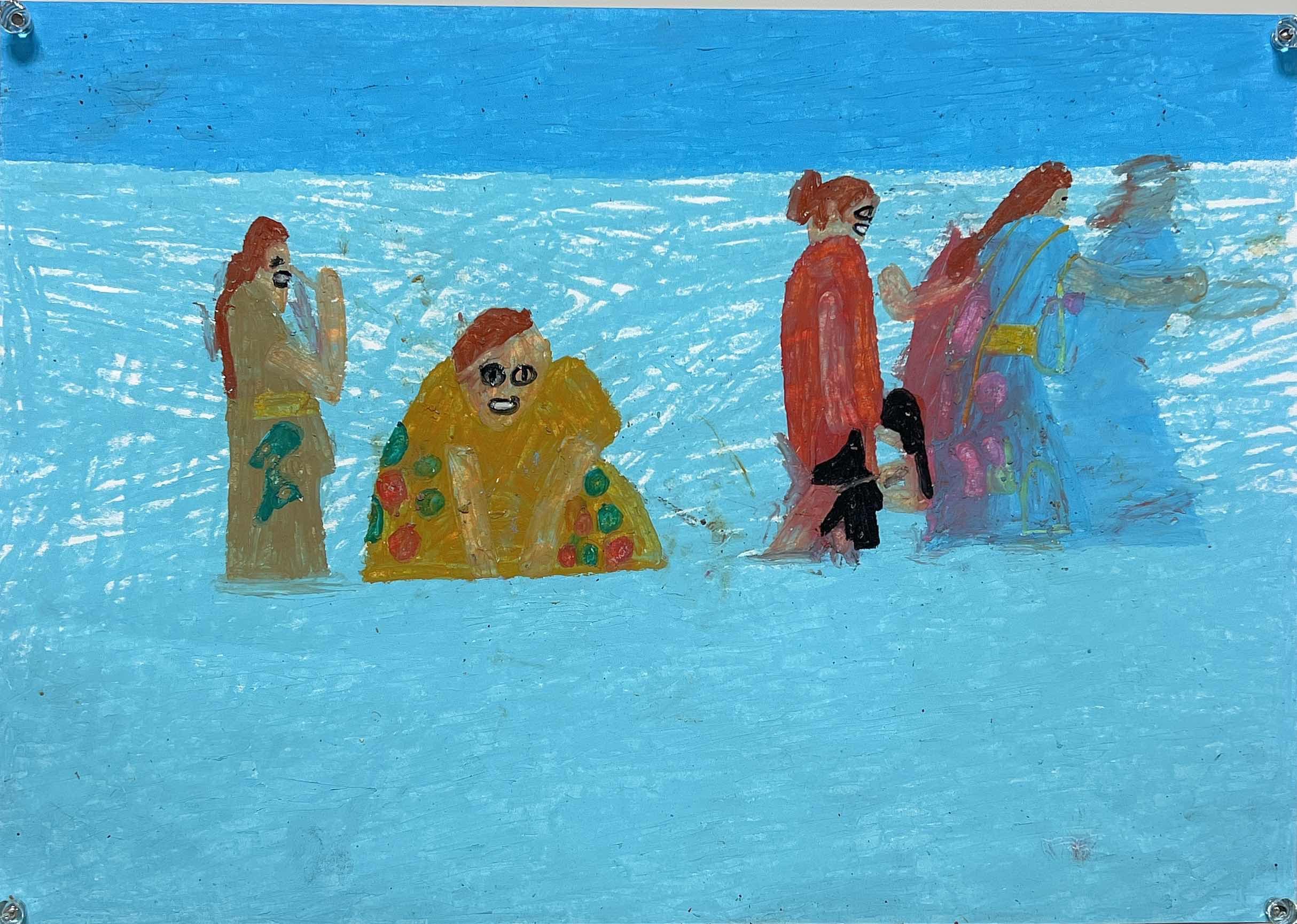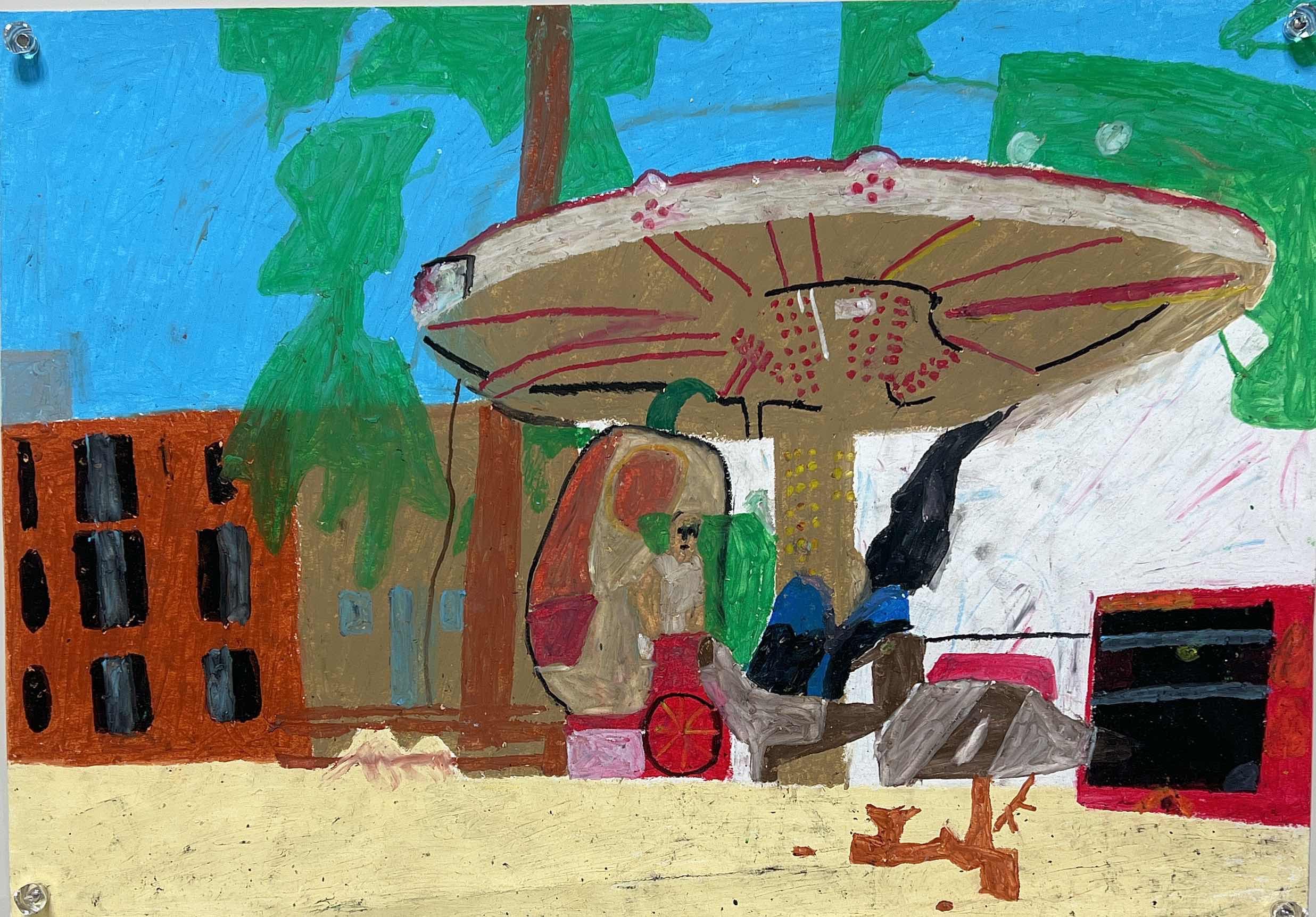 『ご覧頂きありがとうございます。作者は藤井健太で、年齢は27歳になります。青陽東絵画教室へ通い始めて10年近くたちます。いつも通うのをとても楽しみにしています。始めの頃は、クレパスで1~2色を画用紙いっぱいに塗るだけでしたが、本人が自閉症なので何かを見て描くほうが描きやすいかと思い、また先生からの助言もあり、写真(新聞の切り抜き)を用意すると今の作風のようになりました。描いている時は集中して、速くクレパスが折れるほど力強く描きます。作品は、本人の感性でもとの写真からはだいぶ変形され、色も少し違うものが選ばれていたりします。ご覧になって、もとの写真はどんな風か想像してみたり、温かい空気感が伝わりましたらうれしいです。(お母様より)』
